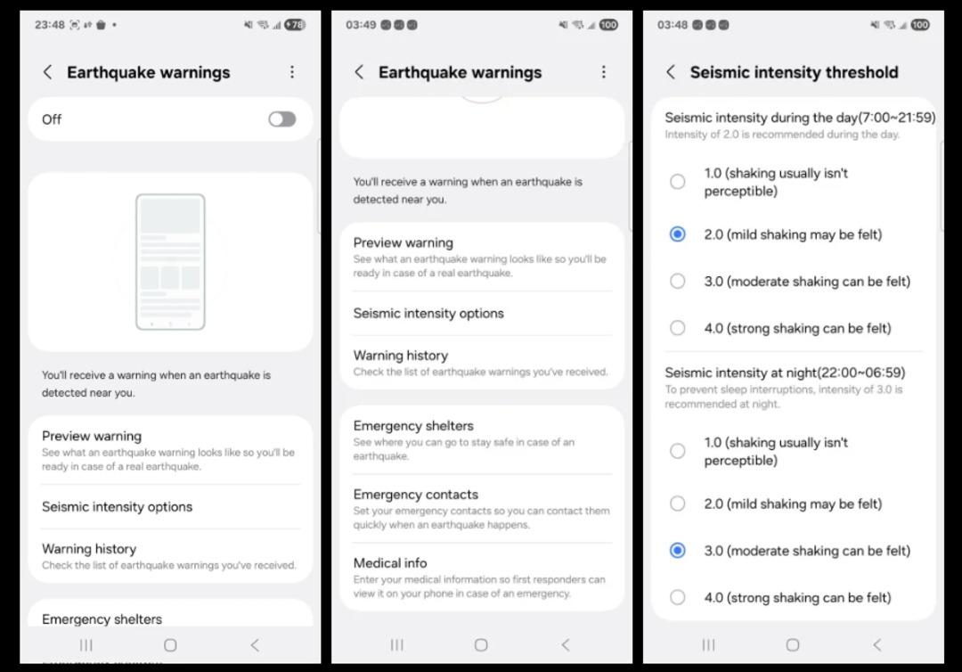 Samsung’un deprem uyarı sistemi, Google’ın deprem uyarı sistemine göre birkaç ekstra seçeneğe sahip. Samsung, bu uyarıların nasıl göründüğünü önceden görmenizi sağlıyor ve önceki uyarıların kaydını tutabiliyor. Ayrıca hem gündüz hem de gece sismik yoğunluğa göre uyarıların ne zaman geleceğini özelleştirebiliyorsunuz. Samsung ayrıca yakınlardaki acil durum barınaklarının bir listesini de gösteriyor ve acil durumda temas kurulacak kişiler ile tıbbi bilgilerinizi ekranda gösterebiliyor.